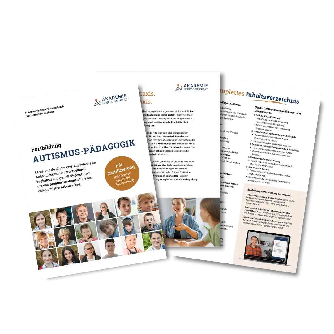 Dann hol dir jetzt die Infobroschüre zur Fortbildung Autismus-Pädagogik mit dem kompletten Inhaltsverzeichnis.